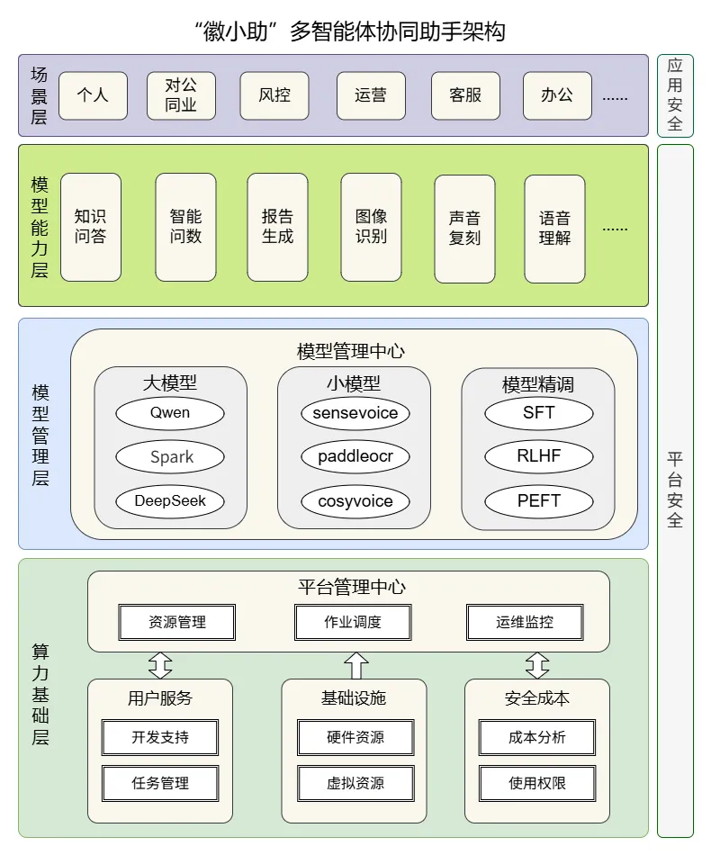 1、基于专精大模型、业务流程和知识库的协同驱动。“徽小助”方案摒弃了通用模型“泛而不精”的局限性,采用“垂直领域精调+动态知识增强”的双重策略,确保智能体的专业性与准确性。针对银行信贷、风控、合规、资管等专业场景,构建高质量的专属训练数据集,采用LoRA(低秩适应)、P-Tuning(提示微调)等高效参数微调技术,对基础大模型进行深度领域适应,使其真正“读懂”金融术语、理解业务逻辑、遵循监管规则,成为具备金融专精能力的助手。将业务流程作为技能,提供给模型查询和学习,让模型了解行内业务流程的执行过程。动态更新的体系化知识库,构建覆盖宏观政策、行业研究、公司情报、内部规章等多维度的层级化金融知识图谱与文档库,通过检索增强生成技术,让智能体在回答或分析时,能实时检索、关联并引用最新的权威知识,有效解决大模型的“幻觉”问题与知识滞后性,确保输出的每一个结论都有据可依、有时效保障。
