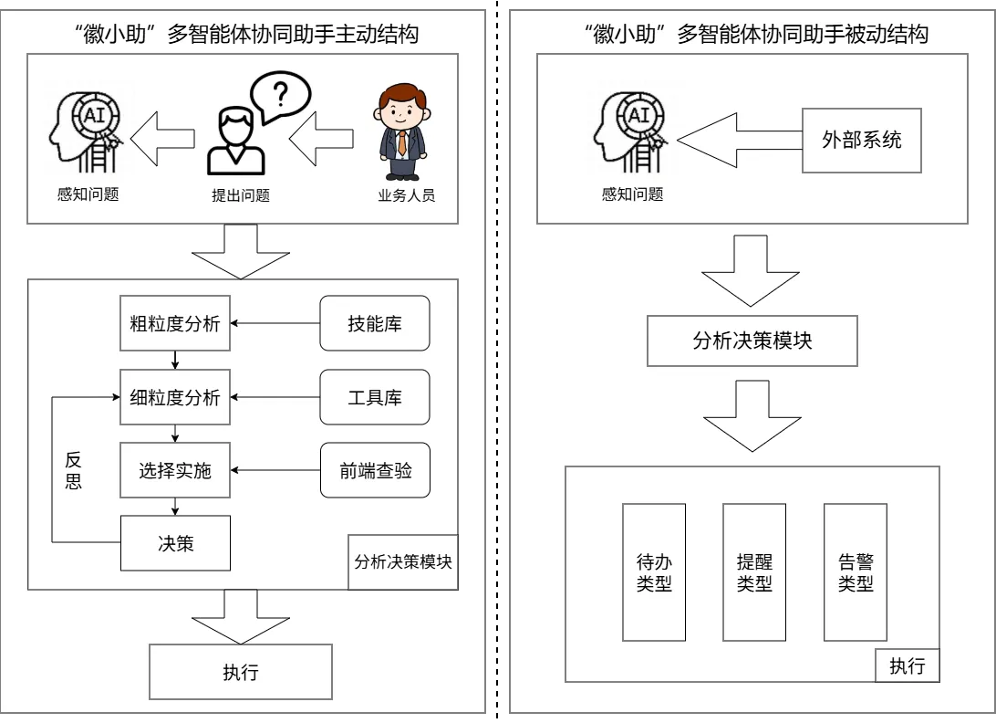 “徽小助”的业务流程由主动触发与被动触发双模驱动,二者在统一的智能决策中枢汇合,形成一个具备感知、分析、决策与执行的闭环系统。