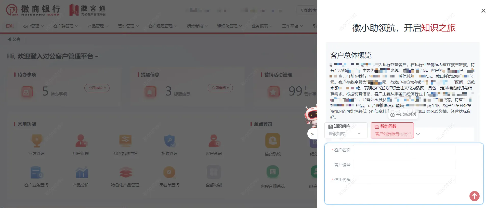 “徽小助”作为我行智能化转型的核心引擎,已成功将能力注入个人金融、对公与同业、风险控制、智能客服、运营管理、协同办公及科技研发等等关键场景,取得了显著的效率提升与服务优化成效。
